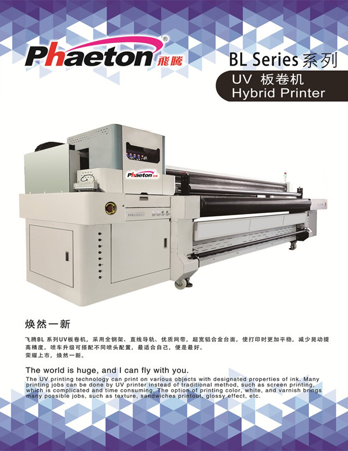 銀河BL系列UV板卷機(jī),采用全鋼架、直線導(dǎo)軌、優(yōu)質(zhì)網(wǎng)帶,超寬鋁合金臺(tái)面,使打印時(shí)更加平穩(wěn),減少晃動(dòng)提 高精度。噴車升級(jí)可搭配不同噴頭配置,最適合自己,便是最好。 榮耀上市,煥然一新。
